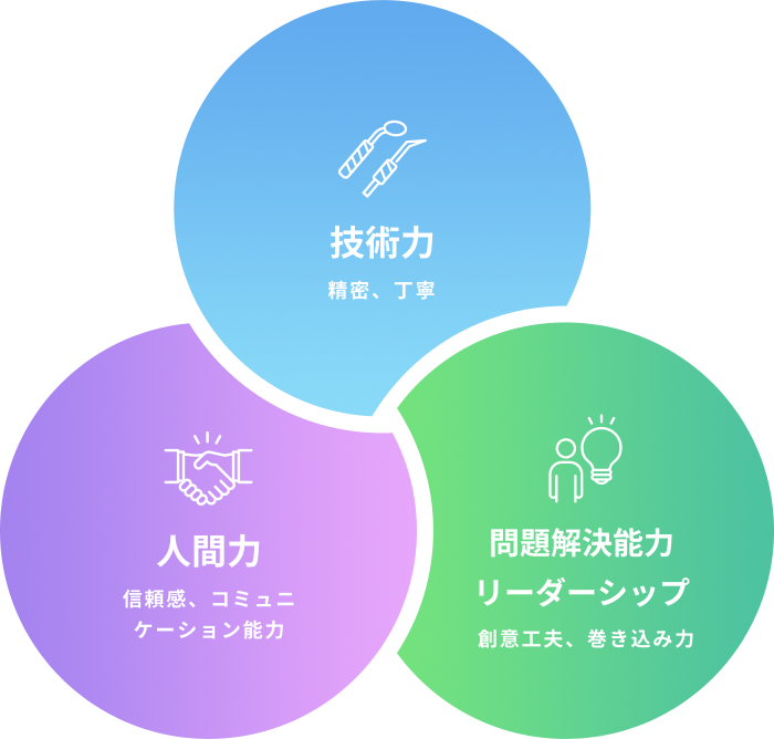 かつらやま歯科医院では、「技術力」「問題解決能力・リーダーシップ」「人間力」の3つの力を伸ばすことを柱に、臨床現場で自信を持って活躍できる「Good Dentist」を育成します。